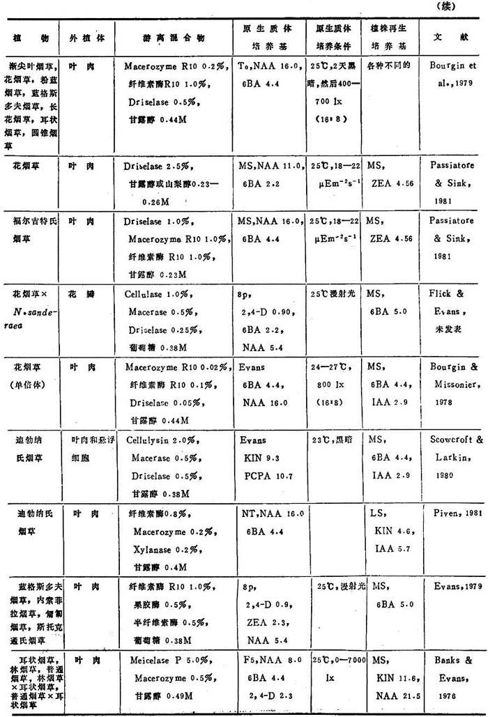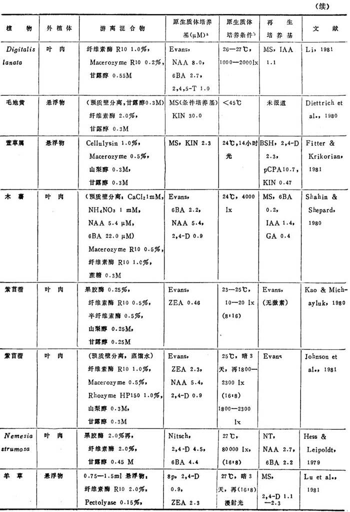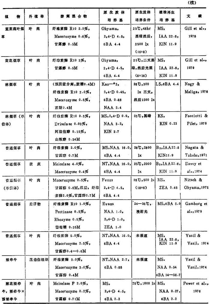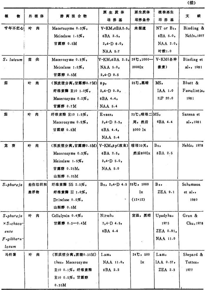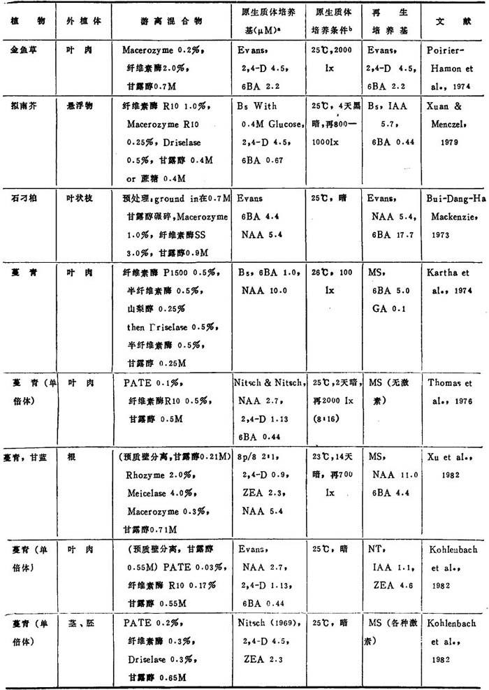 a.表7、8、9中的培养基: BSH Schenk & Hildebrandt,1972 Kao, Kao,1977 Ohyama Ohyama & Nitsch,1971 Lam Lam,1975 8p,6p Kao & Michayluk,1975 B3 Sacristan & Melchers,1969 LS Linsmaier & Skoog,1965 To Bourgin et al.,1976 MS Murashige & Skoog,1962 Upadyha Upadyha,1975 B5 Gamborg et al.,1968 Nitsch Nitsch & Ohyama,1971 V-KM Binding & Nehls,1977 DPD Durand et al.,1973 Nitsch & Nitsch,J·P·&Nitsch, V47 Binding,1974 F5 Frearson et a1.,1973 Nitsch C·,1969 Z Zapataet al.,1977 Green Green,1977 NT Nagata & Takebe,1971 Kao3 Ka.o et al.,1974 b.培养条件:光—暗周期表示为光:暗(h),即,(15∶9)=i5h光和9h暗 近年来,非茄科植物能从原生质体再生植株的名录已坚定地扩大了(表3-8)。这个名录中包括了28种双子叶和单子叶植物。在这28种植物中,包括了若干经济上重要的作物,它们是胡萝卜、苦苣、木薯、苜蓿、珍珠粟、三叶草、油菜、无竺葵、甘蓝和柑桔。原生质体植株再生仍然有点限于一定植物族。例如,这个名录包括十字花科和伞形花科的许多种植物。然而,最近成功地报告豆科(苜蓿属)和禾谷类(狼尾草属水稻和黍属)锦葵科陆地棉(1986)的植株再生,这是鼓舞人心的,因为这些族通常都被考虑是不可能再生成植株。 植株再生的多数报告,不如培养基成分和环境条件的详尽实验那样完善。因此,不可能把这些植物再生植株的一般程序普遍化。在常用培养基取得有限的成功之后,极少数作者创立了他们自己的培养基。这点表明,培养基成分对原生质体培养比外植体培养更重要。在多数情况下,原生质体培养都用室温,说明温度不是关键。然而,不同植物种之间的适宜光强度有显着变化,可从完全黑暗到80,000lx。使用的植株再生培养基也随植物种而改变,例如,胡罗卜愈伤组织在无激素B5或MS培养基通过胚胎发生,而黍属细胞悬浮培养体在1—2μM2,4-D的MS培养基上再生植株。因此为了植株再生策划从原生质体恢复迅速生长的愈伤组织,并把愈伤组织转移到种的特殊再生培养基上。 表3-8 非茄科植物原生质体的植株再生程序