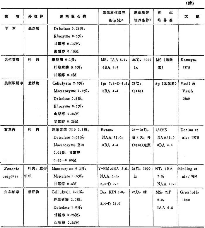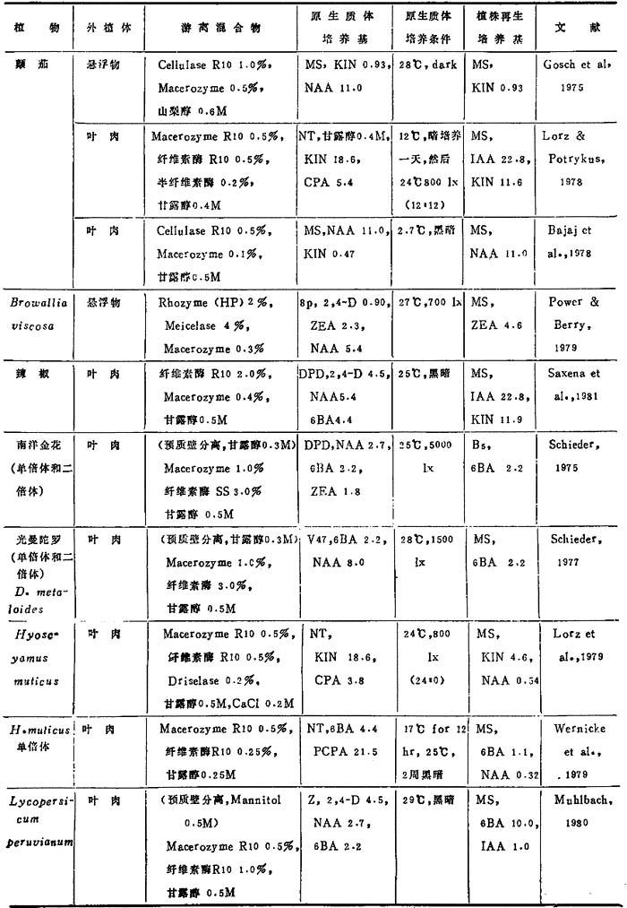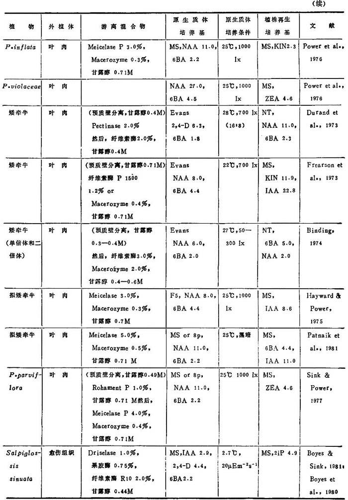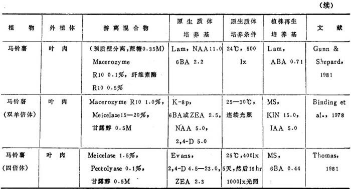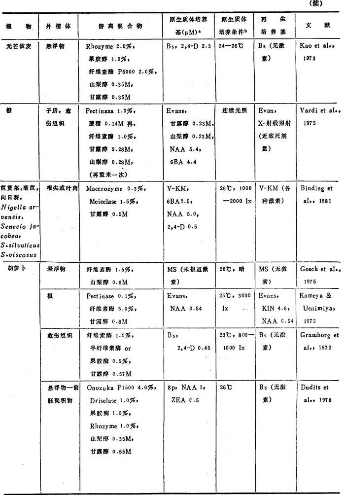 a.表7、8、9中的培养基: BSH Schenk & Hildebrandt,1972 Kao, Kao,1977 Ohyama Ohyama & Nitsch,1971 Lam Lam,1975 8p,6p Kao & Michayluk,1975 B3 Sacristan & Melchers,1969 LS Linsmaier & Skoog,1965 To Bourgin et al.,1976 MS Murashige & Skoog,1962 Upadyha Upadyha,1975 B5 Gamborg et al.,1968 Nitsch Nitsch & Ohyama,1971 V-KM Binding & Nehls,1977 DPD Durand et al.,1973 Nitsch & Nitsch,J·P·&Nitsch, V47 Binding,1974 F5 Frearson et a1.,1973 Nitsch C·,1969 Z Zapataet al.,1977 Green Green,1977 NT Nagata & Takebe,1971 Kao3 Ka.o et al.,1974 b.培养条件:光—暗周期表示为光:暗(h),即,(15∶9)=i5h光和9h暗 近年来,非茄科植物能从原生质体再生植株的名录已坚定地扩大了(表3-8)。这个名录中包括了28种双子叶和单子叶植物。在这28种植物中,包括了若干经济上重要的作物,它们是胡萝卜、苦苣、木薯、苜蓿、珍珠粟、三叶草、油菜、无竺葵、甘蓝和柑桔。原生质体植株再生仍然有点限于一定植物族。例如,这个名录包括十字花科和伞形花科的许多种植物。然而,最近成功地报告豆科(苜蓿属)和禾谷类(狼尾草属水稻和黍属)锦葵科陆地棉(1986)的植株再生,这是鼓舞人心的,因为这些族通常都被考虑是不可能再生成植株。 植株再生的多数报告,不如培养基成分和环境条件的详尽实验那样完善。因此,不可能把这些植物再生植株的一般程序普遍化。在常用培养基取得有限的成功之后,极少数作者创立了他们自己的培养基。这点表明,培养基成分对原生质体培养比外植体培养更重要。在多数情况下,原生质体培养都用室温,说明温度不是关键。然而,不同植物种之间的适宜光强度有显着变化,可从完全黑暗到80,000lx。使用的植株再生培养基也随植物种而改变,例如,胡罗卜愈伤组织在无激素B5或MS培养基通过胚胎发生,而黍属细胞悬浮培养体在1—2μM2,4-D的MS培养基上再生植株。因此为了植株再生策划从原生质体恢复迅速生长的愈伤组织,并把愈伤组织转移到种的特殊再生培养基上。 表3-8 非茄科植物原生质体的植株再生程序