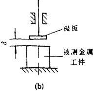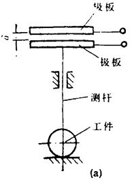 其中L和ΔL分别为电感量和电感变化量;δ和Δδ分别为空气间隙量和间隙变化量。电感式测微仪具有较高的放大比,目前其灵敏度可达0.01μm。 2.电容式参量放大 电容式参量放大是将被测量转换成极板间、极筒间或极板与被测件间的电容量的变化,再将电容的变化量引入专门电路,给出电压信号,确定被测工件的变化量,其原理如图3.3-10。图(a)是接触式结构,(b)是非接触式测量。