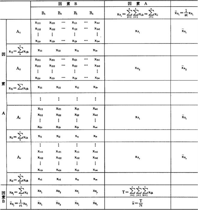 | 释义 | 双因素试验设计 当同时考察两个因素对实验指标是否存在显着性影响时,可以选择两因素的不同水平交叉搭配进行实验。例如有因素A和B,参加实验的水平数分别为r和s,不同水平之间两个组合后共有rs个实验方案。如果每一方案再重复t次,那么总的实验次数为n=rst。这种一个方案不漏的实验方法称为全面实验,也是双因素实验设计的基本思想。在双因素实验的方差分析中,除了分别检验两个因素对实验结果的显着性外,还要考察它们的联合作用的显着性。 依照费歇尔实验原则,双因素实验同样应当遵守完全随机化方法,必要时也要安排局部管理。但是,由于双因素实验的次数明显增多,在一些精度要求不高的或者时间要求紧迫的情况下,可以采用不重复或者不等重复的实验方法。所谓不等重复是指在不进行重复实验的方案中,只对个别预计是重要的水平或水平组合另增加几次实验,观察其重复精度。可见实验方法是具有一定灵活性的,但本节讨论的重点是等重复实验的方法。 1.双因素实验数据统计表 为了获得较多的信息,提高实验结论的精度,特别是欲考察是否存在两因素的交互作用时,都应该按照重复实验的方式设计实验。实验数据统计的格式如表4.3.3-1所示。 表4.3.3-1 双因素实验数据统计表