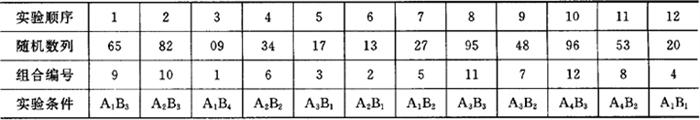 (2)取随机数作为实验顺序 根据随机化原则,从等概率的随机置换表中任点一位数字起头,连续顺序组合成2位或3位数,以其大小依次对应组合编号排成实验顺序。例如用铅笔尖闭目点到21行的随机数为:658209347……,取两位数为一组,按随机顺序进行实验,其条件如表4.3-9所列。 表4.3.3-3 随机化实验顺序的设计