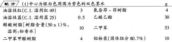 除铝粉外,将各种物料按配方量混合,于常温下搅拌1d,然后加入铝粉浆,再搅拌1d,即得书写笔迹为银白色,周围呈现紫色轮廓的双色墨水。