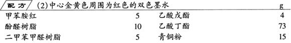 除青铜粉外,将配方所列各种物料按配方量混合,在常温下搅拌1d,然后加入青铜粉继续搅拌1d,即得笔迹为金黄色,周围呈现红色轮廓的双色墨水。