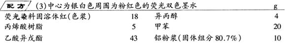 除铝粉浆外,将配方所列各种物料按配方量混合,在常温下搅拌1d,然后加入铝粉浆,继续搅拌1d,即得笔迹为银白色,周围为粉红色的荧光双色墨水。