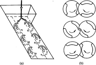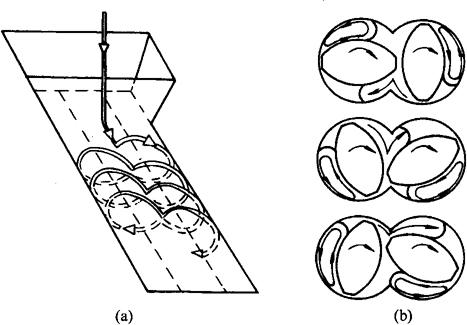 图3-6-12 异向转动啮合型双螺杆工作示意图 (a)物料纵向流动 (b)物料在螺旋中流动 |