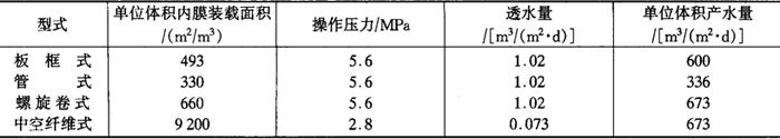 图4-12-7 反渗透原理图 利用反渗透原理,可以从水中除去90%以上的溶解盐类和99%以上的胶体、微生物、微颗粒和有机物。因此,反渗透已广泛用于海水淡化、生产锅炉淡化水、制备蒸馏水、纯净水、超纯水等,又可实行细菌及病毒的分离以及完成果汁、牛乳、咖啡、啤酒的分离、浓缩及脱色等工作。 (二)反渗透器结构 反渗透器的关键元件是半透膜,目前常用的有醋酸纤维素膜和芳香聚酰胺纤维膜。随着膜的结构形式不同,反渗透器的型式也多种多样,主要有板框式、管式、螺旋式和中空纤维式等四种。它们的工艺流程可以采用一级或二级进行。 这四种型式反渗透器生产能力如表4-12-7所示。 表4-12-7 四种型式反渗透器生产能力