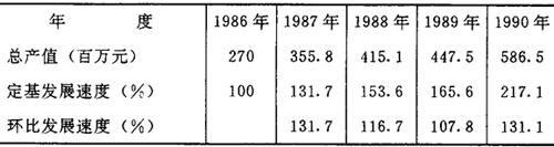 表明事物现象在时间上的变动程度的相对指标。它是报告期水平同基期水平之比,用百分数或倍数表示。其计算公式为:发展速度=报告期水平/基期水平×100%,发展速度大于100%时,说明发展趋势是上升;小于100%时,说明发展趋势在下降。由于对比所用的基期不同,分定基发展速度和环比发展速度。前者是各期水平与某一固定基期水平相比,表明事物现象在各该时期内总的发展程度;后者是各期水平均与上期水平相比,表明事物现象逐期的发展程度。如某企业1986~1990年工业总产值发展速度(见表2-1)。