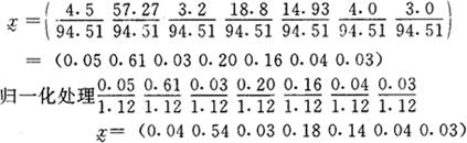 式中:xi为各种病虫发生面积占被害作物种植面积的百分比,归一化后组成模糊向量;C表示与x1相对应的级别,由 于 例如:临沂市1990年小麦种植面积为94.51万亩,主要病虫发生面积和程度依次为:叶锈病(x1)4.5万亩,2级;白粉病(x2)57.27万亩,3级;纹枯病(x3)3.20万亩,1级;麦蚜(x4)18.00万亩,3级;麦蜘蛛(x5)14.93万亩,3级;地下害虫(x6)4.0万亩,2级;其它害虫(x7)3.0万亩,1级。 先求出模糊向量