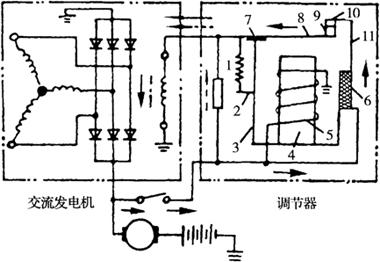 图3-33 单触点振动式电压调节器 1.弹簧 2.调节臂 3.铁轭 4.铁心 5.吸引线圈 6.绝缘条 7.连接板 8.动铁 9.动触点 10.固定触点 11.支架 当发电机转速升高时,发电机电压也随之提高。当电压超过限制的电压时,由于通过吸引线圈的电流增大,吸力加强,吸力对动铁产生的力矩大于调压弹簧拉力对动铁的力矩,使触点打开,激磁电路内串入附加电阻,激磁电流减小。由于发电机电压与激磁电流成正比,所以发电机电压也随之下降。当电压降到低于限额电压时,通过吸引线圈的电流减小,吸力减弱,调压弹簧又将触点闭合,隔开附加电阻。由于激磁电路中的电阻减小,激磁电流增大,又使发电机电压提高。电压上升后,触点又被打开,电压降低,触点又闭合。如此反复动作,动铁反复振动。尽管发电机转速提高,但发电机电压却被维持在额定电压不变。 |