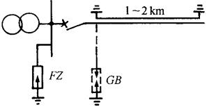 图11-21 3150~5000kVA变电所35kV侧的防雷措施 FZ为阀型避雷器 GB1、GB2为管型避雷器 JZ为空气间隙 (2)3150kVA及以下的变电所,当其供电负荷不足时,35kV侧可采用简化接线(图11-22a);当容量不大于1000KVA,则采用图11-22b的接线方法。