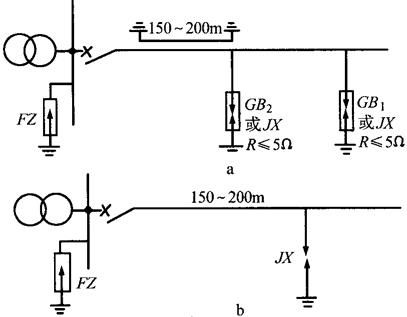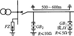 图11-22 3150kVA及以下变电所供电给非重要负荷时35kV侧的简化防雷措施 a.当变压器的容量在1000~3150kVA之间时 b.当变压器的容量为1000kVA及以下时 FZ为阀型避雷器 GB1、GB2为管型避雷器 JX为空气间隙 (3)3150kVA及以下35kV非重要负荷的分支变电所可采用图11-23所示保护措施。