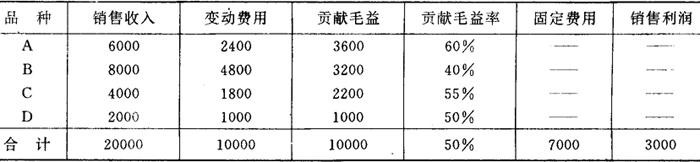 2、多品种生产企业的利润计划 上面已经谈到变动成本适用于测定损益分界点以及目标利润达到点,但对于产品种类是单一的还是多种的并未涉及。实际上,对于利润计划重点的问题是,众多品种中选择有利的品种,在各种制约条件下采用最科学的组合程度,这才是真正意义上的利润计划。为此,上述损益分界点的分析方法,过于简单而不起作用。这种测定方法的适宜和范围,只能是单一产品的情况。 在这个小问题里,我们来看看变动成本法应用于多品种的情况。多品种的情况,也有几种类型。多品种生产的代表是分类生产。从广义来说,等级品或联产品生产也属于多品种生产。 a.生产等级和联产品的情况 严格来说,等级品和联产品性质是不同的,它们的生产成本作为混合成本是所有产品共同发生的。换句话说,假定在利润计划上不考虑各品种(或等级)的产量和销量;进一步说,品种之间的数量比例是固定的,以所有品种的总销售收入决定所要达到的目标利润,就是利润计划。 这种情况的成本,也是对所有产品综合进行计算的,因此固定费用、变动费用也可一并计算。即如果所有产品总括计算的变动费用率(对销售收入)和各该计划期间的固定费用总额决定了的话,根据图表或计算公式,可以测定出达到目标利润额的目标销售收入。 这样确定的销售收入,按照事先确定的产品等级或者品种的构成比例进行分配即可。 b.生产分类产品的情况 ①品种的销售收入构成固定,或至少短期内可以固定的情况,这种情况可以比照联产品或等级品的方法来考虑。下面举一例加以说明。 〔例〕某公司生产四种产品,上年度的销售损益以变动成本法计算表示,如图表2-3表示: 图表2-3
