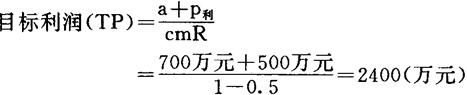 上述公式中的分母cmR是什么意思呢?它是贡献毛益对销售收入的比例,即“贡献毛益率”。“贡献毛益”是指销售收入减去变动费用(或从销售价格中减去单位变动费用)后的初次利润,可以认为是每个产品获利能力的具体表现。所以,上面的计算公式是计算用边际利润回收支出的固定费用,需要多少销售收入。换句话说,与边际利润加固定费用相等的销售收入意味着损益分界点。 如果以这种理解为前提,可以说明目标利润的达到点,就是与固定费用加目标利润额以及贡献毛益相等的销售收入。用公式表示情况如下: