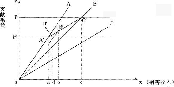 可是,实际上因为在经营上各方面有许多限制,一般的情况下做不到随意选择特定的品种进行生产和销售。比如在生产方面,专用设备、专门技术人员、熟练工人的不足,原材料困难等;在销售方面,专门销售人员、商店销售能力和运输能力的不足等,况且在策略上对修改计划的因素也必须考虑进去。这样,以贡献毛益率为中心指标,同时也考虑到各品种的限制条件,来搭配备品种的销售额,另一方面,需要以完成目标利润来确定销售额。为此,图表2-4的品种贡献毛益表就有用。 图中的x轴表示销售额,y轴表示贡献毛益。从p点起与x轴平行的直线表示贡献毛益目标的高度。从原点o引的斜线oA、oB、oC是产品A、B的计划贡献毛益线。这些贡献毛益线同x轴平角的正切,表示贡献毛益率。从图表2-4中可以看出,各种产品的贡献毛益率大小的顺序是A>B>C。 图表2-4 多品种生产企业贡献毛益