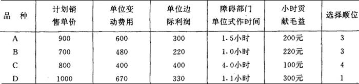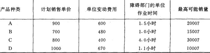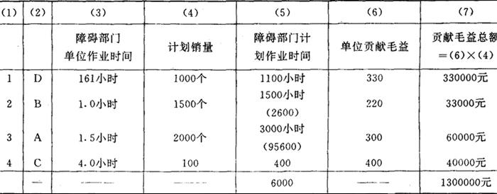 这种情况,首先要选择A产品,以oa为它的销售额限度,得到的贡献毛益为Tcm。但还不能收回全部计划固定费用。接着,以第二位的B产品销售为ab的话,贡献毛益的大小为B’b,这已经可以收回全部固定费用了,但还未达到目标利润。于是,由C产品销售得到的贡献毛益,就是为达到目标利润额需要增加的C产品的销售收入。贡献毛益的变化以折线‘oABC’来表示,它同预先画的目标利润线的交点C’上,决定目标利润达到点的销售额oc,以此来决定利润计划,各种产品销售收入的搭配应为A产品是oa,B产品是ab,c产品是bc。 另外,折线oA’B’C’在A’B’区间同固定费用线D点相交,与它相对应的销售收入od是“损益分界点”的销售收入。此外,从某种观点来看,如果认为这里支出的搭配不理想,就需要对销售收入进行调整,以达到计划的要求。这也意味着,调整参考短期利润计划决策人之间的意见。所以,用变动成本法算出的贡献毛益的资料,对经营决策是不可缺少的。 ③存在障碍的利润计划。上例是在利润计划中,考虑到各项限制条件,现实在确定各品种的销售收入,即确定混合销售收入的方法。但是,严格来说,这个问题是企业存在障碍的利润计划上发展,主要是生产能力上的障碍,特别是设备能力上的问题多,它在计划期间是以开动时间受到限制的障碍部门的形式出现。 在这种情况下,对产品的选择和搭配,只以单位产品的贡献毛益额或以贡献毛益率为指标是不够的。所以,需要求出单位产品在障碍部门每一小时的贡献毛益,以它为指标来确定顺位和搭配品种。下面举一个例子。 〔例〕根据下列资料,决定各品种的目标销售额,并且算出计划销售利润总额,如图表2-5所示。 图表2-5