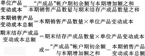 本期完工产品固定生产成本与期末结存在产品固定生产成本的分配按以下公式计算: 本期完工产品固定生产成本=“生产成本”表帐上固定生产成本期初余额与本期增加额之和×本期完工产品产量÷(本期完工产品产量+期末结存在产品约当产量) 或=“生产成本”表帐上固定生产成本期初余额与本期增加额之和用细线表示减号!本期完工产品固定生产成本 根据以上计算结果,本期完工产品的变动成本、固定成本及完全成本应由“生产成本”表帐贷方所属三栏分别转入“产成品”表帐借方所属三栏;期末在产品变动成本、固定成本及完全成本则分别记入“生产成本”表帐余额栏下属各栏。 (4)在本期销售产品与期末结存产品之间进行成本分配并作帐务处理。本期销售产品与期末结存产品之间的变动成本的分配按以下公式计算: