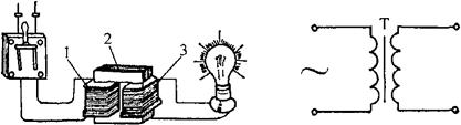 图7-1 变压器的基本结构及符号 1-原边绕组 2-铁芯 3-副边绕组 铁芯是变压器的磁路部分,为了减小涡流及磁滞损耗,铁芯多用厚度为0.35~0.5mm的硅钢片叠成。 绕组常称为线圈,是变压器的电路部分。与电源连接的绕组称为初级绕组或原边绕组,简称初级或原边;与负载连接的绕组称为次级绕组或副边绕组,简称次级或副边。 (2)理想变压器的计算公式 在理想情况下,即变压器无损耗时的有关计算如下: ①变压公式