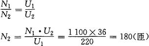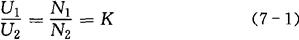 式中 U1——初级交变电压的有效值(V); U2——次级交变电压的有效值(V); N1——初级绕组的匝数; N2——次级绕组的匝数; K——初、次级的电压比,或称匝数比,简称变比。 上式表明,变压器初、次级绕组的电压比等于它们的匝数比K。当K>1时,N1>N2,U1>U2,这种变压器称为降压变压器。当K<1时,N1<N2,U1<U2,这种变压器称为升压变压器。可见,当变压器的初、次级绕组采用不同的匝数比时,就可达到升高或降低电压的目的。 [例7-1] 已知某变压器的初级电压为220V,次级电压为36V,初级的匝数为1100匝,试求该变压器的变比和次级的匝数。 [解] 变比