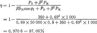 式中 η——效率; P1——变压器的输入功率(W); P2——变压器的输出功率(W); ∑P——变压器的总损耗(W); PCu——铜损(W); PFe——铁损(W); PK——短路损耗(W); P0——空载损耗(W); cosφ1——变压器初级功率因数; cosφ2——变压器的负载功率因数; β——负荷系数; βm——变压器效率最高时的负载系数; U1——变压器初级交变电压有效值(V); U2——变压器次级交变电压有效值(V); I1——变压器初级交变电流有效值(A); I2——变压器次级交变电流有效值(A); U2N——次级额定电压(V); I2N——次级额定电流(A); SN——变压器的额定容量(W)。 [例7-4] 一台容量为50kW的单相变压器,初级、次级电压为6000V/230V,电流为8.33A/217.4A,空载损耗P0=360W,短路损耗PK=1000W。当次级电流为150A时,求次级功率因数cosφ2=0.8时的效率η及次级功率因数cosφ2=0.9时的最高效率ηm。 [解] 负载系数β