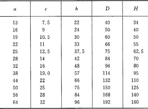 c=0.5a (7-19) h=1.5a(当a>64时h=2.5a) (7-20) D=3a (7-21) H=2.5a (7-22) 迭厚 b≤2a (7-23) 图7-4为表7-3的对应图。