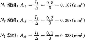 式中 取Bm=9600G。因此 N1=U1N0=220×3.5=770(t) N2=1.05U2N0=1.05×215×3.5=792(t) N3=1.05U3N0=1.05×6.3×3.5=132(t) 式中 1.05是考虑增加5%的匝数,以补偿负载时的电压降。 ⑤计算导线直径d。 选取△=3A/mm2,求出各绕组所用导线截面积。