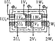 各绕组排列布置如图7-7(b)所示,其中绝缘衬垫选用如下: 对地(铁芯)绝缘:用二层电缆纸(0.07mm)夹一层黄蜡布(0.14mm)厚度γ=2×0.07+0.14=0.28(mm)。 绕组间绝缘:与对地(铁芯)绝缘相同,即γ=0.28mm; 绕组层间绝缘:原边绕组用一层白玻璃纸δ1=0.04mm;副边绕组用一层电缆纸δ2=δ3=0.07mm。 绕组框架用弹性纸1mm厚,外包对地绝缘共厚B0=1+0.28=1.28mm,因此总厚度为 B=(1.1~1.2)(B0+B1+B2+B3) =1.1{B0+[m1(d1+δ1)+γ]+[m2(d2+δ2)+γ]+[m3(d3+δ3)+γ]} =1.1×{1.28+[10×(0.52+0.04)+0.28]+[13×(0.33+0.07)+0.28]+[1×(0.24+0.07)+0.28]} =1.1×(1.28+5.6+0.28+5.2+0.28+0.31+0.28) =1.1×13.23=14.55≈15(mm) 此绕组厚度接近于铁芯窗宽,故方案可行,但必须紧绕。绕组的引出线布置如图7-7(c)所示。 3.三相变压器 (1)结构 三相变压器可分为由三个单相变压器连接而成的三相组式变压器,如图7-8(a)所示。及三相合为一体的三相芯式变压器,如图7-8(b)所示。