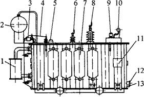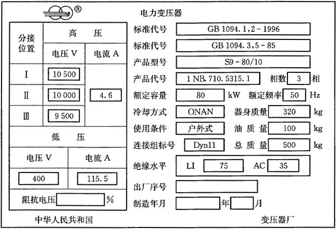 图7-9 SZ9-10000/35型变压器安装图(有载调压) 1-净油器 2-储油柜 3-气体继电器 4-接地线 5-压力释放阀 6-低压套管 7-板式散热器 8-高压套管 9-电动式分接开关 10-开关箱储油柜 11-温度计 12-注油管 13-取样嘴 (2)电力变压器铭牌 每个变压器都有铭牌,它是了解和使用变压器的依据。铭牌上记载了变压器的型号及各种额数据,如表7-6所示。 表7-6 电力变压器铭牌