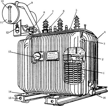 图4-3-12 变压器工作原理示意图 由变压器的工作原理可知,铁芯和绕组是变压器结构的主要部件。另外,为满足安全运行的要求,变压器还有油箱及冷却装置、绝缘套管、调压开关、散热器、储油柜、防爆管、呼吸器、净油器、气体继电器及温度测量装置等部件。图4-3-13为油浸电力变压器外形图,下面分别对各部件作简单介绍。