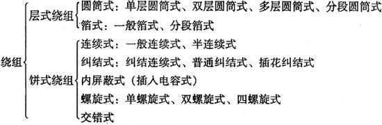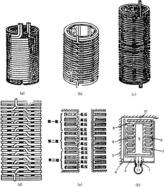 圆筒式绕组就是一个圆筒形线圈,这是同心式绕组的最简单形式,绕制时相邻线匝之间不留空隙,用于容量不大的变压器,一般用在每柱容量200kVA以下的变压器中;连续式绕组从外形看分是许多线饼沿着铁芯柱的高度均匀分布,且在每个线饼之间都有油槽,实际上在各个线饼之间并没有焊接头,整个绕组是用扁铜线连续绕成的,主要用于容量较大的高压绕组也用于电压较高的低压绕组;螺旋式绕组用于低压大容量绕组,其匝数很少,导线截面很大,因此要用多根导线并联起来;纠结式绕组绕法很多,一般是在两个线段内完成一次纠结连接,构成一个纠结单元,纠结式绕组广泛应用于大型变压器的高压线圈,当电压为220kV及以上.时,一律采用纠结式。当电压为110kV时,常采用纠结连续式或纠结式。 交叠式绕组用的不多,只在壳式变压器和电炉变压器等才采用这种绕组。 变压器各种绕组的外形如图4-3-15(a)、(b)、(c)、(d)、(e)所示。