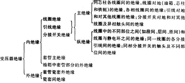 图4-3-15 变压器各种绕组及器身油道导向示意图 (a)双层圆筒绕组:(b)连续式绕组;(c)螺旋式绕组;(d)纠结式绕组:(e)交叠式绕组;(f)双绕组变压器器身导向油道示意图 1-油通道;2-低压绕组下端部绝缘;3-铁芯;4-下夹件;5-低压绕组;6-高压绕组;7-高压下部角环;8-低压绕组上部端绝缘;9-高压绕组至低压绕组绝缘;10-上夹件与压板之间空隙;11-来自油冷却器的油管 变压器的绕组一般都是用电缆纸绝缘的圆形、矩形截面的导线绕制而成,匝间绝缘的厚度110kV应不小于1.35mm;220kV应不小于1.95mm;330kV应不小于2.45mm。匝间绝缘低于此厚度的为薄绝缘,应予以改造。法国550/242/20kV(ODAF)单相自耦变压器匝间绝缘厚度为2.7mm,加强段厚度为4.2mm。 为有利于绝缘,在高低压绕组之间,以及低压绕组与铁芯之间用绝缘套筒隔开。有的绕组匝数较多,需绕多层,为增强层间绝缘强度,在每层间用0.06~0.2mm的电缆纸隔开。 变压器绕组的引出线浸在油里,位于绕组和油箱之间,应加强绝缘。引线绝缘包扎应完好、无变形、变脆,引线长短应适宜,不应有扭曲别劲,引线绝缘厚度应符合要求。引线绝缘的厚度与电压有关,10kV以下应不小于3mm;35kV应不小于6mm;110kV应不小于20mm(在增加油间隙的情况下,可减少到10mm);220kV应不小于20mm。大电流引线(铜排或铝排)与箱壁间距离一般应大于100mm,以防漏磁引起发热。铜(铝)排表面应包扎一层绝缘,以防异物形成短路或接地,引线与各部位的距离应符合安全技术要求。引出线所用的绝缘材料,对于3~35kV级可采用胶木纸管、电缆纸和漆布;对于110kV级及以上用电缆纸绝缘,并用漆布包扎予以加强和保护。 (3)绝缘:变压器内导体之间和导体与地之间的介质结构称为变压器的绝缘。变压器的绝缘结构按其部位与功能分类如下: (4)油箱和冷却装置:为了加强绝缘和冷却,将装好的变压器铁芯和绕组浸入变压器油中。变压器油有两个作用:①作为变压器的相与相、相与地之间的绝缘用;②散热作用,通过油在受热后的对流作用或强迫油循环的方法,把铁芯和绕组在变压器工作的情况下所产生的热量传给油箱壁或冷却器。