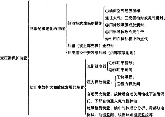 变压器的冷却装置可以有效地将变压器本身所产生的热量散到周围的空间或其它介质中,从而保证变压器各部分的最高温度和最大温升不超过规定值。 变压器的冷却方式主要有:油浸自冷式、油浸风冷式、强迫油循环风冷式、强迫油循环水冷式等。一些巨型变压器的结构上,在强迫油循环冷却方式中还采用了“导向冷却”技术,即利用油泵将冷却后的油直接送入油箱内的“导向油路”,可以直接对绕组冷却,冷却效果大大提高,这就是强迫油循环导向风冷或水冷的冷却方式。双绕组变压器强迫油循环导向冷却油道示意图见图4-3-15(f)所示。 (5)总装结构:任何一台变压器都是许多作用不同的部件组成的。属于变压器器身部分的有绕组、铁芯,属于变压器的辅助部分(组件)的有:油箱、高压套管、调压分接开关、散热器、储油柜(油枕)、防爆管、呼吸器、净油器、气体继电器及温度测量装置等。 变压器各部分的绝缘常用的电工绝缘材料有下列几种: 电缆纸:用作电磁线的绝缘、绕组层间绝缘和引线绝缘等。电缆纸的厚度一般为0.12mm,高压电缆纸有0.045,0.075,0.125,0.175,0.225mm等不同厚度。 电话纸:制成卷状,用作层间绝缘、引线和分接头绝缘。 黄漆布带:用作线圈绝缘,加强机械强度。 电工绝缘纸板:用作线圈间的垫片、板条、绕组的绝缘支撑、隔板、垫圈和放在绕组间的圆筒。 变压器油:灌注在油箱和充油套管中,作为绝缘和冷却用。 纸-胶木绝缘:制成管状和圆筒状,用作引线、绕组间的绝缘和绕组与铁芯间的绝缘。 胶木板:用作接头板、分接开关板等。 电瓷:用作变压器的套管和固定引线的部件。 斜纹棉带和缎带:用作绕组线匝和引线绝缘等的机械固定。 木材:用作垫块或支撑件。 浸渍用漆:绕组的浸渍物,常用的有甘油磷苯二甲酸漆等。 玻璃丝和石棉绝缘:用作电磁线的绝缘。 六氟化硫:不燃烧绝缘介质,是代替变压器油作为绝缘和冷却用的气体介质,对于变压器的防火防爆具有重要意义。 (6)变压器保护装置。为了保护变压器的安全,除装设继电保护装置以外,变压器本身还应有以下保护装置。