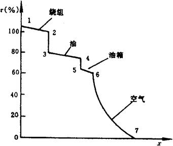 式中:τ——变压器绕组或油对周围介质(空气)的温升; τi——物体的起始温升; τs——物体的稳定温升; T——发热时间常数,绕组一般为5~6min;变压器油一般为2.5~3.5h 当τi=0时(变压器刚投入运行时) τ=τs(1-e-t/T) 当τs=0时,即当变压器负荷移去后(变压器停运后) τ=τ:e-t/T) 变压器中每一发热体的温升、冷却均可利用上述三个公式计算。 变压器投入运行后或停止运行后,发热过程或冷却过程便开始,出现新的温升或温降数值,绕组对油的温升经20~30min可达到稳定值,油对空气的温升需经12~18h后才可达到稳定值。油与绕组相比较,发热和冷却都显得十分缓慢,升温和降温都比较慢,这是因为油的时间常数比绕组大得多。 油浸式变压器运行时,热量的散发大多以传导、对流及辐射的方式向外扩散,进行散热冷却。由于散热冷却条件不同,各部分的温度并不一致,相对于周围环境空气有不同的温度值,油浸式变压器各部分温度分部情况见图4-3-16。其散热过程如下: