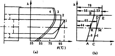 图4-3-16 油浸式变压器各部分温度分布情况 (1)热量由绕组和铁芯内部以传导的方式传至导体或铁芯的表面,这部分温差通常为几度,图中以曲线1-2表示。 (2)铁芯和绕组表面的热量,以对流方式传至变压器油中,这部分温差约占绕组对空气温升的20%~30%,图中以曲线2-3表示。 (3)变压器油以对流方式,将热量传至油箱或散热器内表面,这部分温差很小,图中以曲线4-5表示。 (4)油箱和散热器内表面的热量经传导方式传至其外表面,这部分温差一般为2~3℃,图中以曲线5-6表示。 (5)热量最后由油箱和散热器外壁经对流和辐射散发至周围空气中,这部分温差较大,约占总温升的60%~70%,图中以曲线6-7表示。 为保证变压器绕组、铁芯、绝缘、变压器油等各部分温度在规定范围之内,必须装设可靠而有效的冷却系统。 小容量变压器多采用油自然循环空气自然冷却方式;容量超过10MVA的变压器,采用油自然循环强迫空气冷却方式;大容量变压器多采用强迫油循环风冷或强迫油循环水冷方式,实现油和水的强迫循环,使热油经过强风(或水)冷却器冷却后,再用油泵送回变压器,以提高变压器的冷却效果;对特大型容量变压器,为进一步提高冷却效果,还广泛采用导向冷却,即在高低压绕组和铁芯内部设有一定油路,使进入油箱内部的冷油全部通过绕组和铁芯内部流出,从而可带走大量的热能,提高冷却效果,降低热点温度,有效的提高散热效率,减小变压器的尺寸,保证变压器的安全运行。 2.变压器的温度分布 油浸变压器运行时,由于发热、散热、冷却条件不同,各部分温度和温升是不同的,图4-3-17为油浸式变压器在额定运行条件下,沿高度的温度的分布图,其中图4-3-17(a)为实际变化曲线图,图4-3-17(b)为分析计算曲线图。