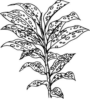 变叶木又名洒金榕。原产南洋群岛,常植于庭院、作绿篱,多为盆养观赏,因其叶片变化多,呈五彩缤纷,斑烂有趣,颇有观赏价值(图2-141)。