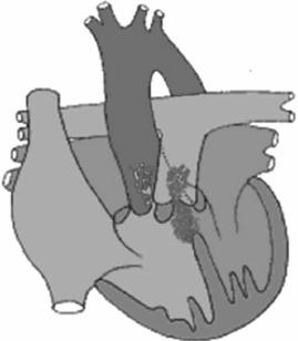 图8-1 右心室双出口示意图 右心室双出口为圆锥与大动脉连接异常,主动脉和肺动脉完全起源于右心室,VSD为左心室的惟一出口,主动脉瓣与二尖瓣之间无纤维连续(图8-1)。而许多学者将肺动脉骑跨在室间隔缺损之上的Taussig-Bing畸形和主动脉骑跨在90%以上的法洛四联症也归入右心室双出口。右心室双出口是一种少见的复杂性先天性心脏畸形,在先天性心脏病中仅占0.48%~1.67%。 (一)病理解剖 右心室双出口的病理解剖学改变多种多样,除VSD大小及其与大动脉关系外,两大动脉的位置关系、圆锥肌束大小等亦有很大变异,分类较为困难。1975年,Van praagh报告的符号命名法用以描述血管段的改变(包括位置、与主动脉和肺功脉的相互关系),再加上文字表示室间隔缺损的位置与主动脉-肺动脉相互关系以及肺动脉有无狭窄,为许多心外科医师所采用。 1.心房心室的连接 心房心室的连接关系上可能有各种情况,约76%心房心室的连接一致,11%心房心室的连接不一致。 2.大血管关系 多数病例两大动脉位置正常,主动脉在肺动脉的右后方;部分病例主动脉在肺动脉的右侧;少数病例主动脉在肺动脉的左前位。 3.室间隔缺损(VSD) VSD为左心室的惟一出口,90%的患者VSD较大,10%的患者VSD较小,没有VSD者罕见。DORV在室间隔完整的情况下,一定合并大的房间隔缺损,为左心血流的出口。主动脉与室间隔缺损的关系对于外科手术很重要,有4种情况:VSD位于主动脉下方、肺动脉下方、在主动脉和肺动脉下方及远离两大动脉。室间隔缺损在肺动脉下方者称Taussig-Bing畸形。 4.流出道 DORV在主动脉及肺动脉下方均可有肌性圆锥,常合并肺动脉瓣狭窄,肺动脉主干及其分支的任何位置均可发生狭窄,与法洛四联症相似,但合并右室双腔心者少见。主动脉下狭窄不常见,常发生在合并肺动脉下VSD的DORV者。 5.传导束 右心室双出口的传导束分布与法洛四联症相似,不过由于主动脉向右转位,其希氏束更靠近左心室面。 6.冠状动脉 冠状动脉的发育也可以不正常,可为单一冠状动脉或前降支异常,如同法洛四联症,发自右冠状动脉,横跨过右心室流出道,到达心尖部。如为主动脉左转位,则冠状动脉跨过肺动脉下方。 本病可合并左心室发育不全,心室上、下排列,二尖瓣狭窄、骑跨,降落伞样二尖瓣,二尖瓣闭锁,完全性房室通道,主动脉弓缩窄或中断,多发性室间隔缺损等。 右心室双出口的分型方法很多,根据肺动脉瓣有无狭窄分为肺动脉高压型(艾森曼格型)和肺动脉低压型(法洛四联症型)。根据VSD与半月瓣的关系分为主动脉下、肺功脉下、双动脉下方及远离大动脉。 (二)病理生理 由于右心室双出口病变不同,可有不同的病理生理改变,本病血流动力学的改变取决于室间隔缺损的位置、大小及有无合并肺动脉狭窄。 腔静脉血经右心房→右心室分别射入肺动脉和主动脉,而肺静脉血回流至左心房→左心室,经过室间隔缺损流入右心室,再经主动脉和肺动脉射出。所以无肺动脉狭窄者,当室缺位于主动脉瓣下时,主动脉主要接受左心室的血液,肺动脉主要接受体静脉回血。此时“自右向左”或“自左向右”分流都很少,临床上甚至不出现明显发绀。当室缺位于肺动脉瓣下时,这些患者“自右向左”和“自左向右”分流都较明显,临床上可出现不同程度的发绀。这类患者由于肺循环亦承受体循环同样压力,必然产生肺动脉高压,而逐渐发展为艾森曼格综合征。合并右室流出道或肺动脉狭窄者,其血流动力学改变类似于法洛四联症。患者出现发绀和低氧血症。如合并其他心脏畸形,还会有相应的病理变化。 (三)分型 按Vanpraagh命名法,将右室双出口分为八个基本类型。临床上SDD型最多见,其次为SDL型和ILL型;SLL型、IDD型、ILD型、SLD型和IDL型较少见。 Lev和Kirklin等从外科治疗观点出发,又根据室间隔缺损的位置与动脉干的关系,将上述每一基本类型又分为四个亚型,即:①主动脉瓣下型室间隔缺损;②肺动脉瓣下型室间隔缺损;③与两大动脉口相关的室间隔缺损;④与两大动脉口无关的室间隔缺损(图8-2)。在上述每一亚型中又有无或有肺动脉瓣狭窄之别。对外科手术有实际指导意义。