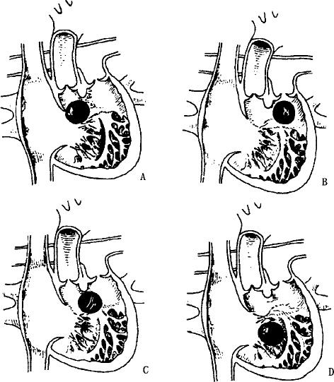 图8-2 右心室双出口的分型 A.主动脉瓣下型室间隔缺损;B.肺动脉瓣下型室间隔缺损; C.与两大动脉口相关的室间隔缺损;D.与两大动脉口无关的室间隔缺损 根据上述分类原则,将右室双出口分为相对常见的六种病理类型。 1.房室关系一致,主动脉右位伴主动脉口下室间隔缺损 这是最常见的类型,房室一致,大血管关系外观正常或主动脉比正常偏右偏前,主动脉和肺功脉均从右室发出,主动脉开口位于右侧。主动脉瓣环与二尖瓣大瓣的正常连续性常为室上嵴的壁束所遮断,若发育过程中主动脉圆锥被吸收,则主动脉瓣与二尖瓣有纤维连接存在。室间隔缺损位于室上嵴下方和主动脉相接近,而与肺动脉远离,它的背侧以二尖瓣大瓣和三尖瓣隔瓣的连接部为界,尾侧、腹侧和头侧均以肌肉为界,缺损通常较大。在这类中又分无肺动脉口狭窄和有肺动脉口狭窄。 2.房室关系一致,主动脉右位伴肺动脉口下室间隔缺损 房室一致,两大动脉均并列出自右心室,外观大致正常,主动脉开口在肺动脉的右侧。缺损位于室间隔的高位,于肺动脉口下方,和主动脉口常有一段壁束隔开。又分无肺动脉狭窄或有肺动脉狭窄两亚型。 Taussig-Bing畸形为右室双出口的一种特殊类型,其特征为主动脉完全起自右心室,肺动脉圆锥轻度左移骑跨于室间隔缺损上方,肺动脉圆锥与二尖瓣直接连接。主动脉可在肺动脉右前方或左前方,无肺动脉口狭窄。Taussig-Bing心脏畸形实际上就是此型中的一个特殊亚型。 3.房室关系一致,主动脉右位,伴两大动脉相关性室间隔缺损 主动脉开口和肺动脉开口并列,主动脉稍在前方,均出自右心室。在有主动脉瓣和二尖瓣连接时,二尖瓣多与无冠窦瓣连接。室间隔缺损一般较大,位置较高,多位于漏斗部,位于两大动脉口之下。主动脉瓣环和肺动脉瓣环融合,主动脉瓣和肺动脉瓣构成缺损的后上缘。有或无肺动脉狭窄。 4.房室关系一致,主动脉右位伴两大动脉无关性室间隔缺损 主要病变和上述两大动脉相关性室间隔缺损型相同;不同之处为室间隔缺损位于肺动脉圆锥下方,在三尖瓣隔瓣下或位于心尖肉柱间,可为多发型或为房室通道型,缺损远离两大动脉瓣。有的室间隔缺损小而限制左室排血。 5.房室关系一致,主动脉左位,伴室间隔缺损 两大动脉出自右心室,主动脉在肺动脉左前方或左侧,呈并列关系,主动脉开口在肺动脉开口左侧,并为壁束分隔,室间隔缺损位于间隔基底部或高位,邻近主动脉或肺动脉。右冠状动脉在肺动脉前横跨右室流出道。有或无肺动脉狭窄。 6.房室关系不一致,伴室间隔缺损 心房心室关系不一致,不常伴存心房、内脏反位。 两大动脉出自右心室,主动脉大多在肺动脉之前及左侧(SLL),少数在右前方(SLD)。室间隔缺损多数在肺动脉瓣下方,少数在主动脉瓣下方。常伴有肺动脉口狭窄和右位心。 房室关系一致时,传导系统的走行与正常心脏基本相同。传导束与室缺的相对关系,依室缺类型而异。 (四)临床表现 临床表现取决于有无右室流出道和肺动脉瓣的狭窄,以及VSD和主肺动脉的位置和关系。患者的表现同VSD合并肺动脉高压,或法洛四联症。高压型DORV自然预后同巨大VSD。如为Taussig-Bing畸形,则与完全性大动脉转位合并VSD相似,肺动脉高压发生早、预后差。如合并肺动脉瓣狭窄,临床表现和法洛四联症相似。 1.症状 临床症状是多样的,无肺动脉狭窄者,肺血多,症状可似大型室间隔缺损,年龄很小就容易感冒,反复肺炎,体重增长缓慢,早期发生充血性心力衰竭;室缺位于主动脉瓣下,早期可无明显发绀;室缺位于肺动脉瓣下,常伴有肺动脉高压,发绀程度不一,此类病例严重发绀者罕见。如伴肺动脉狭窄,临床症状可类似法洛四联症表现,会出现严重发绀,明显杵状指(趾)。有呼吸困难、头痛、头昏、活动受限和蹲踞,少见呼吸道感染及心力衰竭。 2.体征 右心室肥厚可致心前区向前隆起,胸骨左缘第3、4肋间常可听到收缩期吹风样杂音,并能触到细震颤。肺动脉瓣区第二心音亢进或减弱,这主要取决于有无肺动脉口狭窄。 (五)检查 有上述临床表现,疑为本病的患者,需进行下列检查。 1.X线检查 右心室双出口无肺动脉狭窄者,X线表现类似于大型室间隔缺损合并肺动脉高压,可有肺充血、肺纹理增多、肺动脉干明显扩张,心脏呈普大型,主动脉结可有可无。 伴肺动脉口狭窄者则类似于法洛四联症,可有肺血少,肺动脉段凹陷,心脏中等程度增大,以右心房、右心室扩大为主,但不呈典型的靴形心脏。 2.心电图检查 右心室双出口无肺动脉狭窄者,心电图主要表现为电轴左偏(-170°~-30°),右心室肥厚,也可有左心室肥厚,P-R间期延长,常见室内传导阻滞或右束支传导阻滞。 伴肺动脉口狭窄者,心电图主要表现为电轴右偏(90°~160°),右心房增大,右心室重度肥大。 3.超声心动图检查 (1)胸骨旁长轴:可见两条前后平行的大动脉,主动脉在前,肺动脉在后,均自右心室发出,主动脉前壁与室间隔连续中断,主动脉后半月瓣与二尖瓣前叶连续中断。 (2)大动脉短轴:见两个圆形结构均位于室间隔前面,即由右心室发出。合并肺动脉狭窄者可见肺动脉内径缩小,主动脉增宽,反之则为主动脉内径缩小,肺动脉扩张。 (3)心尖及剑突下四腔心:用下腔静脉的肝段位置判定心房位,再根据二尖瓣及肌小梁判断心室的位置,由此可判定内脏与心房位置、心房与心室的连接关系,同时可显示室间隔缺损、房间隔缺损及有无
