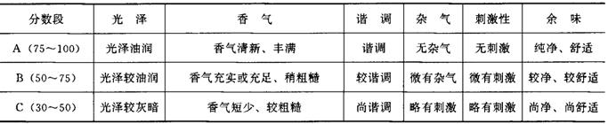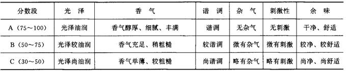 | 释义 | 叶组配方设计依据 卷烟叶组配方以产品的类型、质量风格、消费者的喜好与卷烟生产成本为依据,结合烟叶的品种、等级、质量特点以及与感官质量相关的化学成分经过反复试验筛选而确定。 (一)卷烟产品的类型 我国卷烟产品划分为以下几种类型: (1)烤烟型卷烟。烤烟型卷烟的烟气具有明显的烤烟香气,香气清雅或浓郁,烟碱含量相对较低,吸味较柔和。其配方特点是全部或绝大部分以烤烟烟叶为原料。 (2)混合型卷烟。混合型卷烟的烟气具有烤烟与晒晾烟混合均匀谐调的香气,香气浓郁,烟碱含量相对较高。其配方特点是以烤烟、白肋烟、香料烟或其他晒晾烟为原料。 (3)外香型卷烟。外香型卷烟的烟气具有独特的外加香香气。其配方结构既可全部使用烤烟,也可根据需要掺配部分晒晾烟。由于外加香突出,外香型卷烟可以选用等级相对较低的烟叶原料。 (4)雪茄型卷烟。雪茄型卷烟烟气中具有雪茄烟特有的香气。这种香气主要来源于雪茄型烟叶及其他晒晾烟。 (二)卷烟的感官质量因素及风格特点 卷烟的感官质量一般概括为香、味、色。主要是香气、杂气、刺激性、余味、光泽、谐调。卷烟风格特点包括香气风格、烟味浓度和劲头。卷烟的感官质量因素及风格特点取决于叶组配方中各种烟叶的烟质特点及相互配合作用。 (1)香气:卷烟香气是指卷烟烟气本身所固有的烟草特具的芳香。香气有质和量的双重含义。不同等级的卷烟对香气的质和量要求不同,进行配方设计时应有针对性地选择烟叶类型和等级。 (2)谐调:指卷烟香气和谐一致,感觉不出其中某一单体的特性,如加香加料与烟香调和、叶组配方中各烟叶间的调和。 (3)杂气:非烟草本质气味的、轻微的和明显的不良气息。如青草气、枯焦气、土腥气、松脂气、花粉气、木质气和地方性杂气等。卷烟感官质量越高,要求杂气越少。 (4)刺激性:烟气对感官造成的不适感受。如对鼻腔、口腔及喉部的冲刺,毛棘火燎等。卷烟感官质量越高,要求刺激性越小。卷烟刺激性受烟叶本身质量影响,与工艺处理关系也较为密切,尤其是混合型卷烟。 (5)余味:指烟气从鼻腔或口腔呼出后,遗留下来的味觉感受。它包括口腔内的干净程度和舒适程度。 (6)光泽:指烟丝的油润程度。它与卷烟吸味品质有很密切的关系。烟丝光泽除与烟叶光泽有关外,在很大程度上还取决于工艺处理质量。 (7)劲头:劲头又称生理强度,是烟气对喉部的冲激强度。它不是卷烟的质量指标,而是卷烟风格的一种表现,也是消费者选择卷烟牌号的重要依据。 (8)浓度:烟气浓度是指在口腔中感觉到烟气量的多少,也是卷烟风格的一种表现。 (9)香气特性:是指卷烟烟气的香味特征。由于卷烟配方结构不同而产生的香气清雅,或香气浓馥;香气清新、丰满,或香气浓郁、醇厚;或由加香加料不同所产生的香气浑厚、充实、充足或细腻等特征。香气特征也是消费者选择卷烟牌号的重要依据。 (三)不同段位卷烟对烟质要求 卷烟分数段是衡量卷烟感官质量的技术要求。不同段位的卷烟售价不同,对质量要求也不同。制订各分数段位质量标准是叶组配方的基本依据,同时也是对产品的感官质量进行技术监督的重要依据。我国各类型、各分数段位卷烟感官质量,详见表6-2-1,表6-2-2,表6-2-3,表6-2-4。 表6-2-1 烤烟型卷烟感官质量技术要求