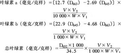 式中:D——吸光度; W——样品鲜重(克); V——样品定容体积(毫升); V1——吸出滤液体积(毫升); V2——比色时的定容体积(毫升)。 注意事项: ①叶绿素的浸出液不可久放,应尽快比色。 ②叶绿素a和b有一定的比例, |