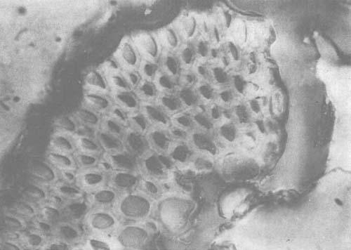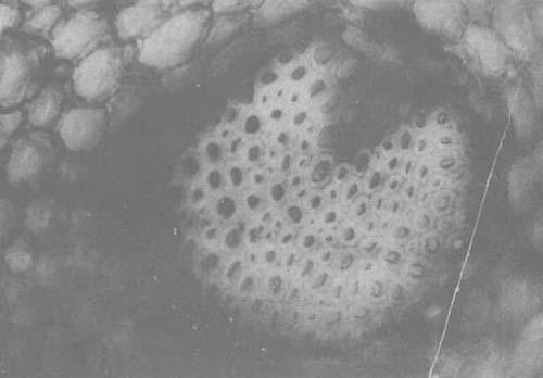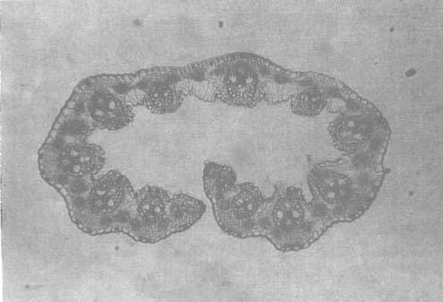 图2-2-6 龙须草横切面×20 剑麻:又名龙舌兰,多年生大草本,叶丛生,质多肉,扁宽,前端尖硬,粉绿色。从叶的横切面可见,剑麻叶也是由很多维管束及薄壁细胞组成。维管束分散在薄壁细胞组织中,外部密,体积小,内部稀,体积大,形状扇形,基部有几个导管及薄壁细胞(图2-2-7及图2-2-8)。