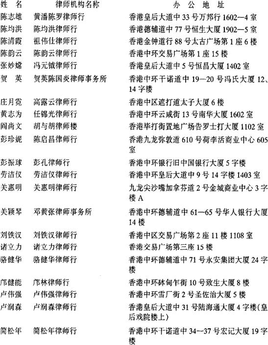 根据1982年2月20日司法部《关于为港澳同胞回内地申请公证出具证明办法的补充通知》、1985年6月11日司法部《关于委托香港八位律师办理公证的若干问题的通知》、1986年9月20日司法部《关于增加委托十八位香港律师事的通知》、1991年11月12日司法部《关于再委托二十三位香港律师办理公证事务并改变出证方式的通知》及1993年第7期《中国律师》所载司法部委托第四批香港公证律师的名单,现汇总如下: