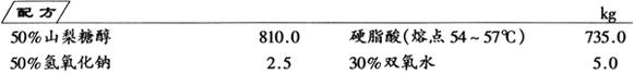 将山梨糖醇加入不锈钢反应釜中,开动真空系统,升温至75~80℃,搅拌,在5.3×103Pa下脱水,直至釜内翻起小泡。将硬脂酸加热熔化,压入脱水的山梨糖醇中,搅拌,再加入氢氧化钠,保持真空,在2h内将温度升到170℃。然后控制每1h升温10℃,保温反应1h,直至升到210℃,再保温反应4h。抽样检验酸值,如酸值<8.5时为合格。静置冷却过夜。除去底层焦化层,开动搅拌,在30min内加入双氧水,加完后升温至110℃,趁热继续搅拌均匀。冷却,即得产品。