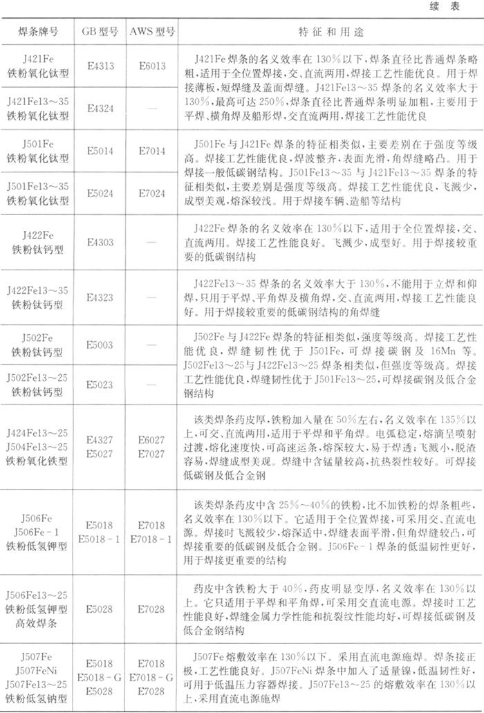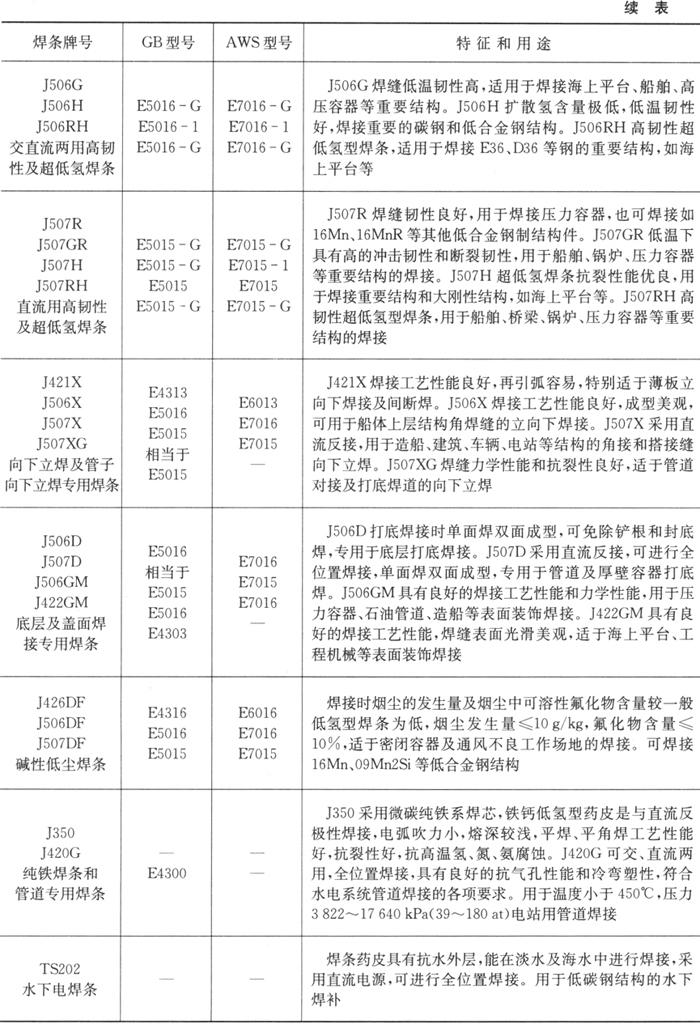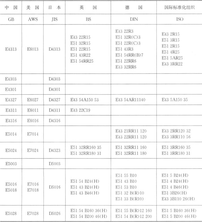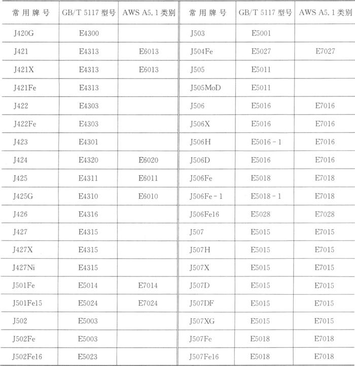 国内外常用碳钢焊条标准和常用焊条牌号见表1.2-16、1.2-17。 表1.2-16 国内外常用碳钢焊条标准型号对照表