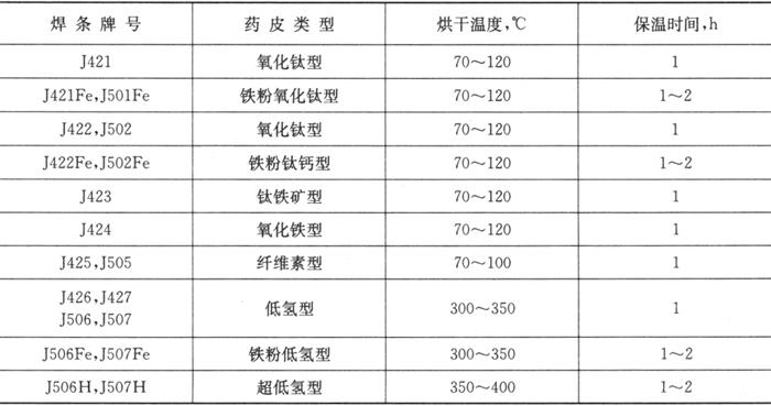 碳钢焊条的再烘干温度汇总于表1.2-14。从表可以发现,再烘干温度是由药皮类型决定的,有的药皮类型烘干温度不能太高(如纤维素型),否则药皮要分解变质,失去保护作用;也有的药皮类型烘干温度不能太低(如低氢型),否则焊缝含氢量增高,易引起焊接裂纹和气孔。 表1.2-14 碳钢焊条的再烘干温度