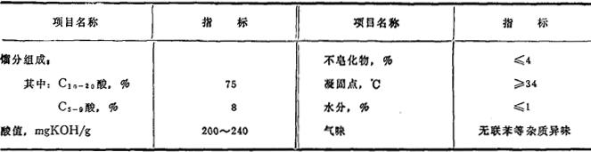 | 释义 | 合成脂肪酸C10~20酸 别名 皂用酸 结构式 C 性能 常温下为白色或微黄色猪脂状固体,微有脂肪酸的特殊气味。不溶于水,溶于有机溶剂。相对密度0.87(80℃)。具有有机酸的通性。 质量规格QB721-79