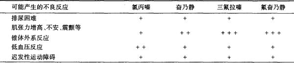 | 释义 | 吩噻嗪类 【适应证】本类药适用于治疗急、慢性精神分裂症、躁狂症、反应性精神病及其他重症精神病的对症治疗,可控制兴奋、攻击、幻想、思维联想障碍及情绪冲动、木僵等症状。不适用于伴随意识障碍而产生的精神异常。小剂量的氯丙嗪、奋乃静或三氟拉嗪也能制止呕吐。 【药理作用】抗精神病的效应系由于在脑内阻断多巴胺受体而致。此类药物还可产生α-肾上腺素受体阻断作用,并可影响下丘脑与脑垂体的内分泌。其镇静作用系由于抑制脑干网状结构的上行激活系统。抑制呕吐系由于影响了延髓的呕吐中枢的活动而致。 【药代动力学】口服后,各种吩噻嗪类药物吸收状况不一致。肌内注射比口服的生物利用度高4~10倍。这类药及其各种代谢降解产物主要分布于脑,其次为肺与其他组织,并可通过胎盘屏障进入胎血循环。具有高度的亲脂性与高度的蛋白结合率。单次给药作用可维持24h。与蛋白结合的吩噻嗪类药及其代谢降解产物排泄缓慢,即使停药已数月,仍可在血或尿内测得。本类药物主要自肾随尿排出。胎儿、婴儿与老龄病人对这类药物的代谢与排出均明显降低。 【不良反应】4种吩噻嗪类药物的不良反应如表12-1所示。 表12-1 4种吩噻嗪类药物不良反应的比较