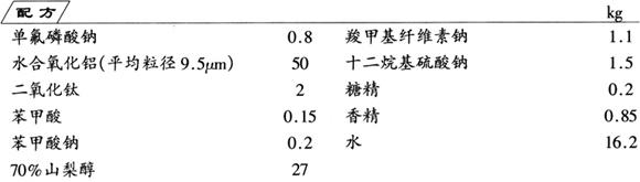 制法 首先,将单氟磷酸钠、苯甲酸、苯甲酸钠、糖精和水加入反应锅内,搅匀后加入羧甲基纤维素钠和山梨醇,加热至80~95℃,煮成胶状物。其次,在搅拌情况下加入水合氧化铝、二氧化钛、十二烷基硫酸钠、香精,继续搅拌2~3h,使各成分混合均匀。冷却至40~50℃碾细。最后,继续冷却至30~40℃,灌装,即成产品。 |