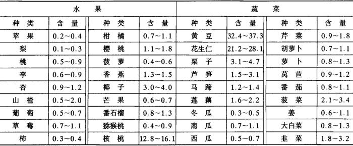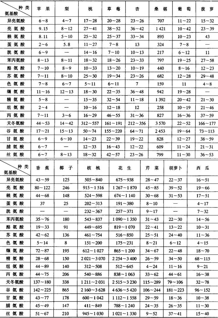 | 释义 | 含氮物质 果蔬中的含氮物质有蛋白质、氨基酸、酰胺以及某些铵盐和硝酸盐等。水果中的含氮物质含量一般0.2%~1.2%。蔬菜中含氮物质的含量,豆类1.9%~13.6%,根菜类0.6%~2.2%,叶菜类1.0%~2.4%,瓜果类0.3%~1.5%。 (一)蛋白质 蛋白质是组成生物体的基础物质,结构很复杂。蛋白质是由许多氨基酸以链状结构组成的高分子多肽,相对分子质量35000~70000。主要果蔬中的蛋白质含量见表2-1-21。 表2-1-21 主要果蔬的蛋白质含量 单位:%