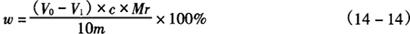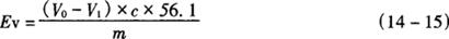 式中 V0——空白试验所耗酸标准溶液的体积,mL V1——滴定试样所耗酸标准溶液的体积;mL c——酸标准溶液的浓度,mol/L Mr——酸的相对分子质量 m——试样的质量,g 平行试验结果的允许差为0.5%。 3.2 按式(14-15)计算酯值(Ev)。