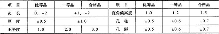 注:其他规格的板材可由供需双方商定,但其质量应符合《吸声用穿孔石膏板》(GB11980-1989)的要求。 吸声用穿孔石膏板产品标记顺序为:产品名称、背覆材料、基材类型、边长、厚度、孔径与孔距及产品标准号。例如,吸声用穿孔石膏板,有背覆材料,边长为600mm×600mm,厚度为12mm,孔径为6mm,孔距为18mm,可标记为:吸声用穿孔石膏板YC600×12- (二)吸声用穿孔石膏板的技术性能 吸声用穿孔石膏板的技术性能,主要包括外观质量、尺寸允许偏差、板材含水率、断裂荷载等。 1.吸声用穿孔石膏板的外观质量 吸声用穿孔石膏板的外观质量,不应有影响使用和装饰效果的缺陷。对以纸面石膏板为基板的板材,不应有破损、划伤、污痕、凹凸、纸面剥落等缺陷;对以装饰石膏板为基板的板材,不应有裂纹、污痕、气孔、缺角、色彩不均匀等缺陷。穿孔应垂直于板面,棱边形状为直角型的板材,侧面应与板面成直角。 2.吸声用穿孔石膏板的尺寸允许偏差 吸声用穿孔石膏板的尺寸允许偏差,应不大于表21-11中的规定。 表21-11 吸声用穿孔石膏板的尺寸允许偏差