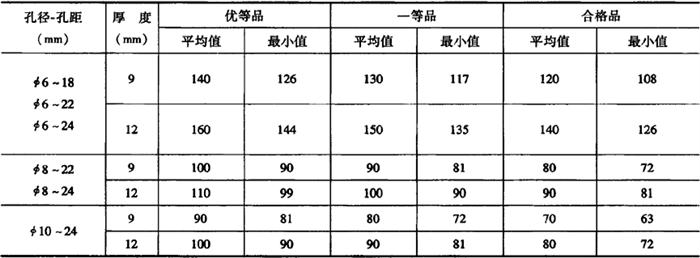 4.吸声用穿孔石膏板的断裂荷载 吸声用穿孔石膏板的断裂荷载,应不小于表21-13中的规定。 表21-13 吸声用穿孔石膏板的断裂荷载 (N)